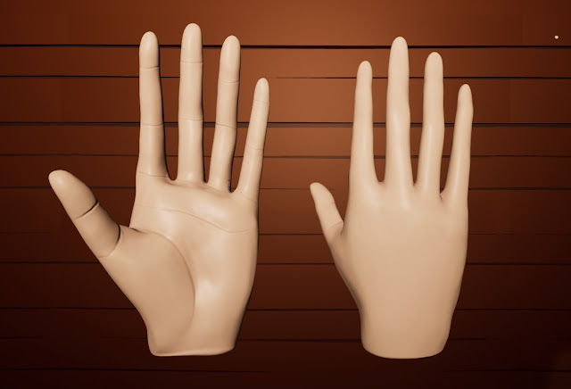 This is what was in the engine for the hand as of last semester. I had created the initial sculpt and auto-retopoed it in ZBrush for Abby to rig so that we could replace the default UE4 mannequin hands that you use in VR with Victor's hands. For this Sprint, I agreed to finish the hands from a modeling and texturing stand point.